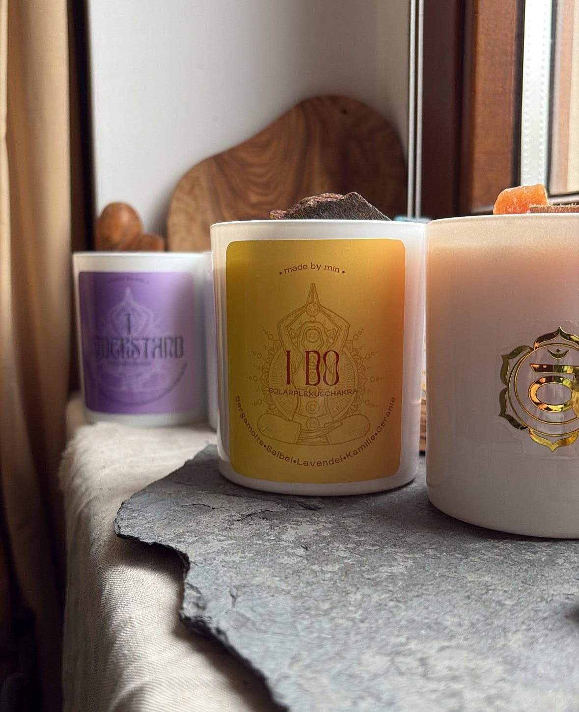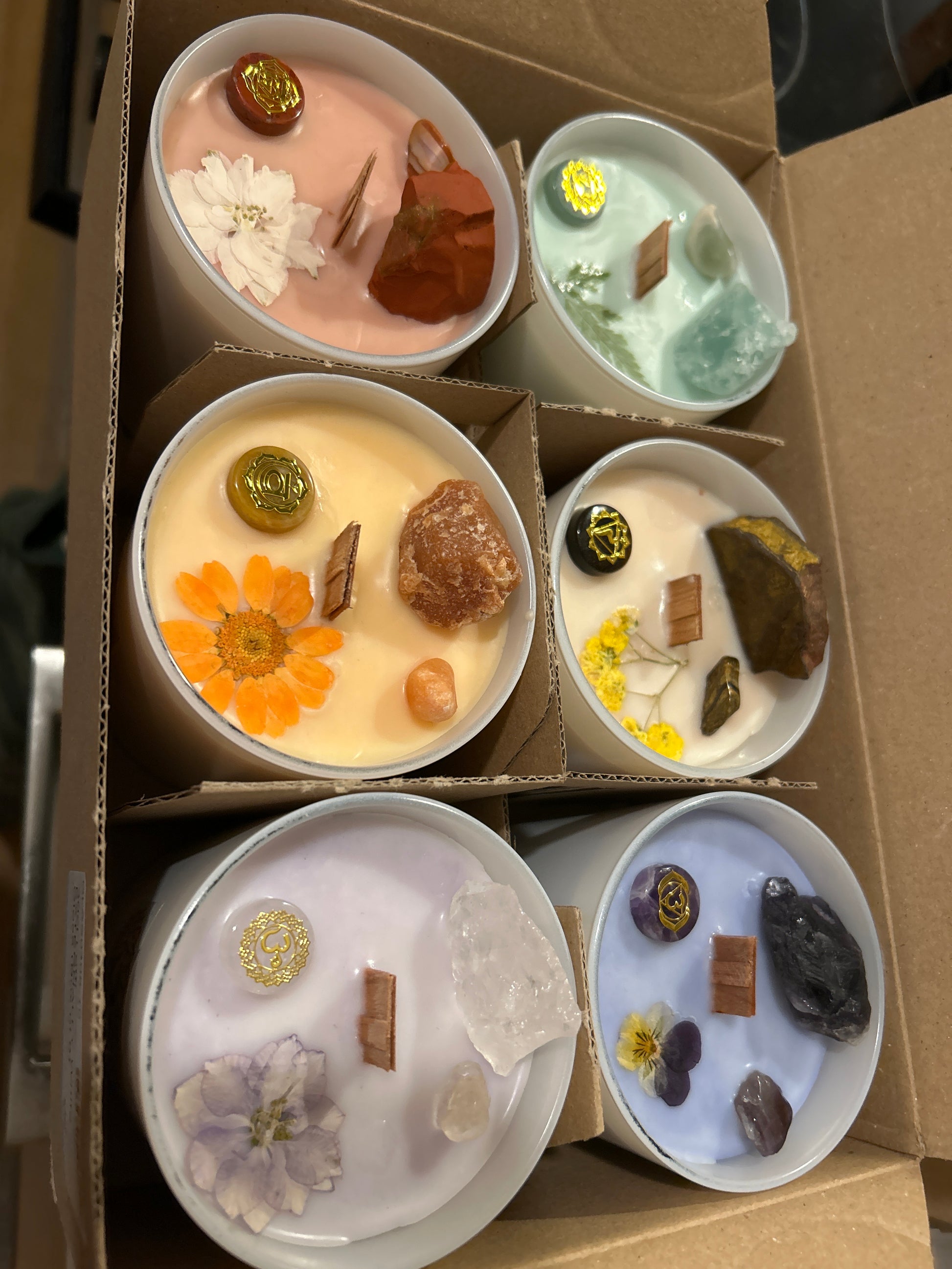 Jede Kerze ist farblich auf das jeweilige Chakra abgestimmt, enthält den passenden Edelstein und trägt das goldene Chakrasymbol – für ein Ritual voller Energie, Achtsamkeit und innerer Balance.