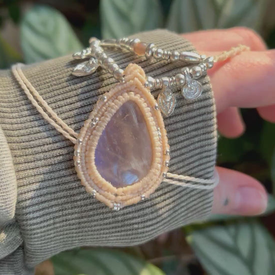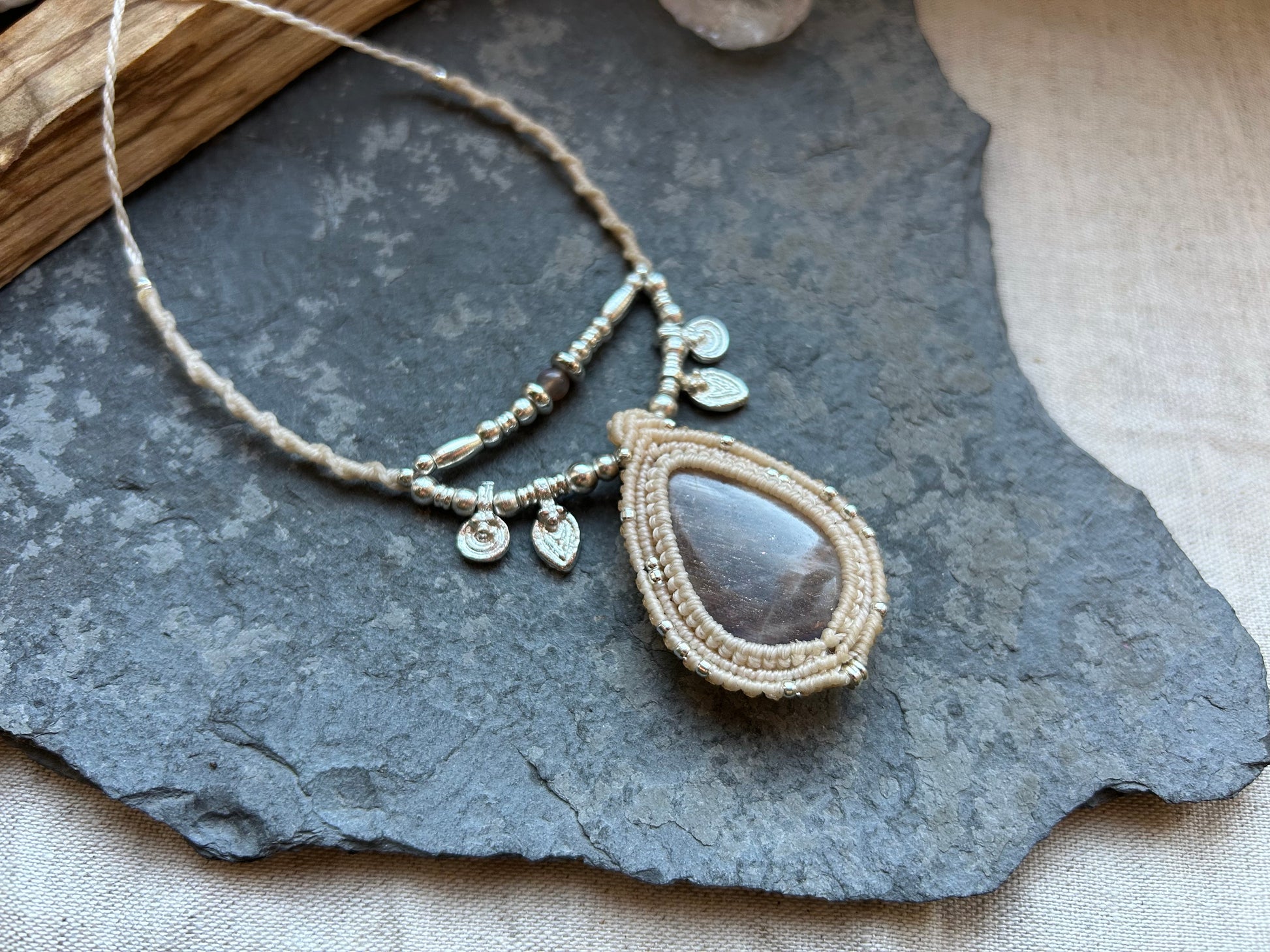 Diese handgefertigte Makramee-Kette vereint die wärmende, vitale Energie des Sonnensteins mit der intuitiven, sanften Kraft des Mondsteins. Die beiden Edelsteine stehen für Balance, innere Stärke und Harmonie - ein Schmuckstück, das Licht und Schatten in sich trägt. Umrahmt von feinstem Linhasita-Garn in natürlichem Farbton und veredelt mit detailreichen Neusilber-Elementen, entfaltet diese Kette ihren besonderen Zauber.